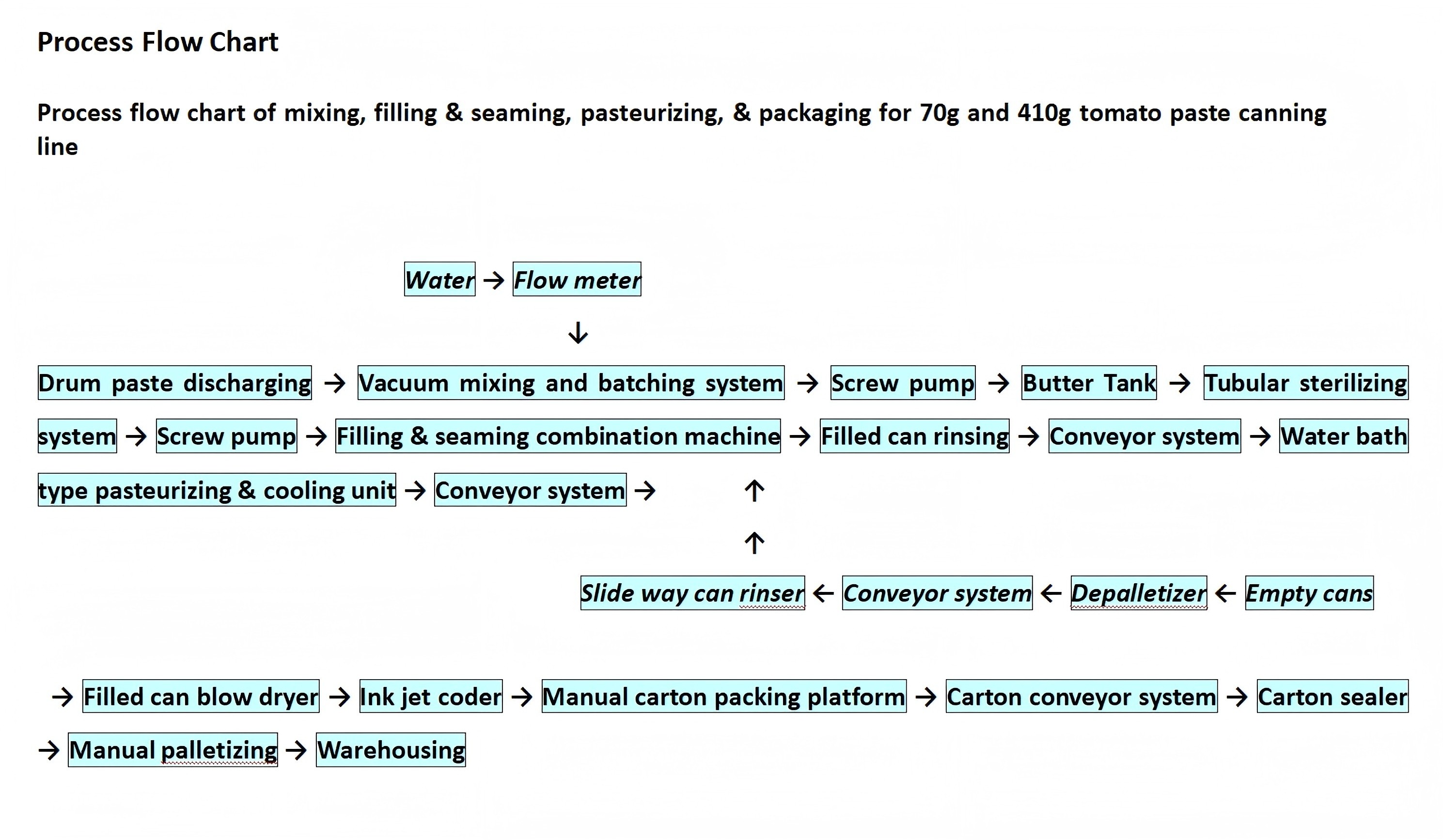Tableau de flux des processus de mélange, de remplissage et de couture, de pasteurisation et d'emballage pour les lignes de conservation de pâte de tomate de 70 g et 410 g